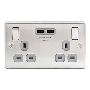 Wickes 13a Twin Switched Socket With 2 X Usb Ports Brushed Steel Wickes Co Uk